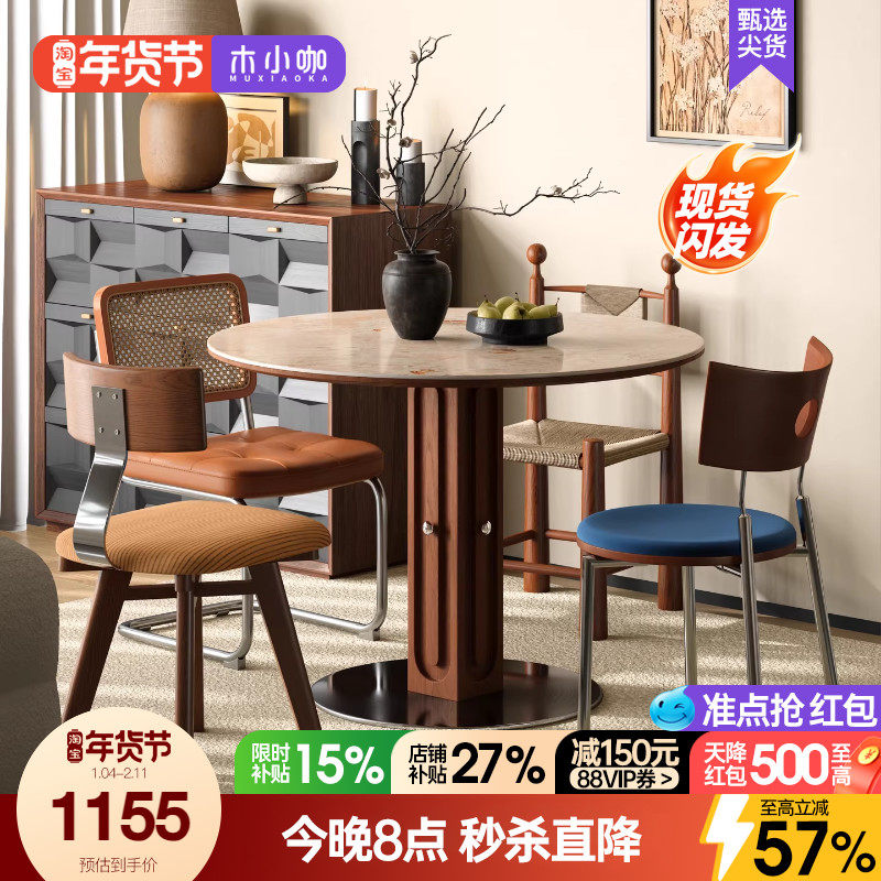 木小咖现代简约实木餐桌维亚圆桌家用小户型中古洞石岩板桌椅组合