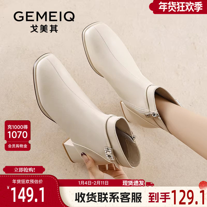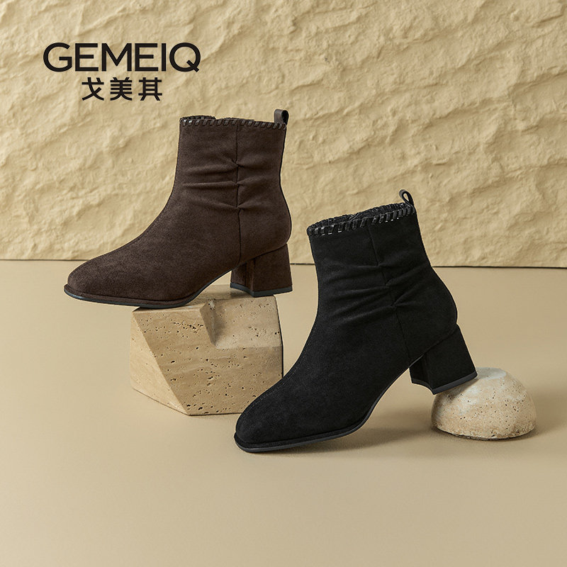 戈美其方头短靴粗跟高跟踝靴气质百搭时装靴瘦瘦靴侧拉链中筒女靴