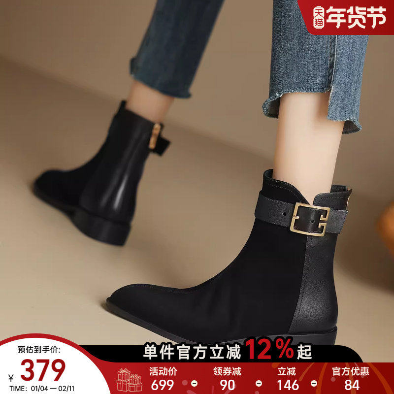 意尔康女鞋2025冬季法式短靴女粗跟气质英伦风加绒女靴舒适及踝靴