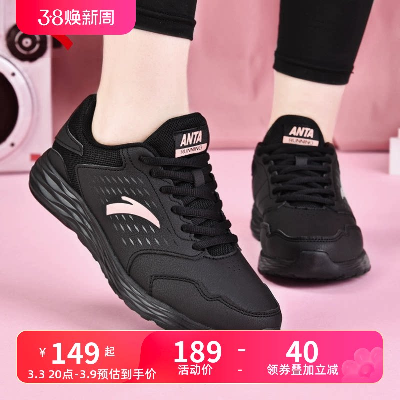 安踏女鞋黑色运动鞋中年妈妈女款防滑鞋子防水鞋皮面跑步鞋旅游鞋