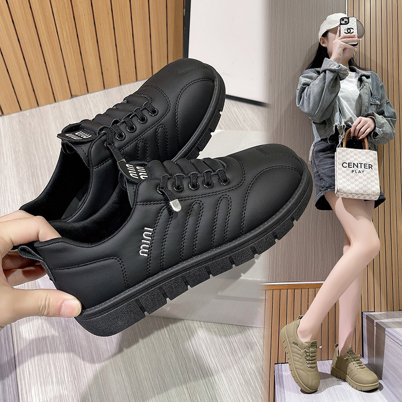 春秋女鞋妈妈鞋中年休闲跑步运动鞋皮面防水轻便旅游鞋波鞋女黑色