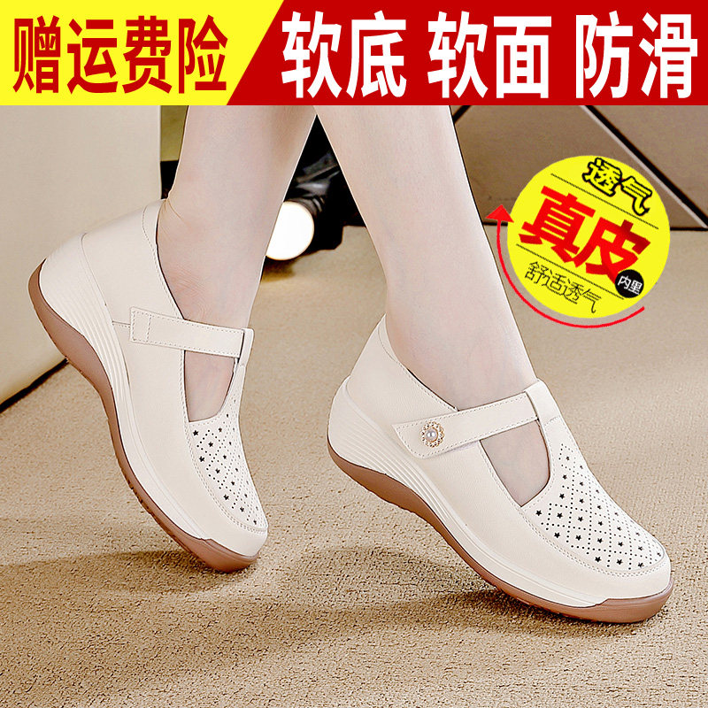 坡跟真皮女鞋镂空透气单鞋女2026夏季新款软底旅游休闲鞋中年皮鞋