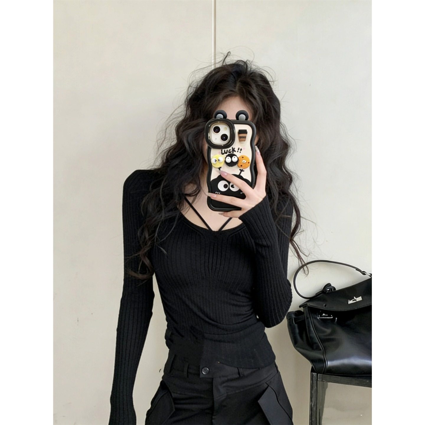 甜辣风V领长袖针织T恤女装秋季显胸大打底衫纯色紧身收腰内搭上衣