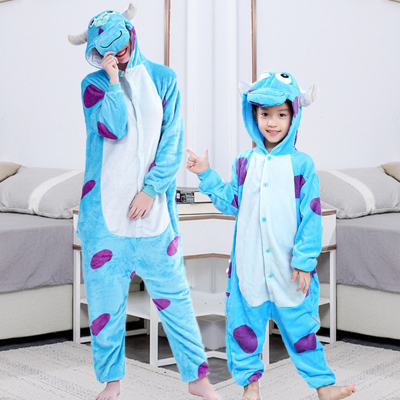亲子连体睡衣冬季保暖珊瑚绒卡通小怪兽一家三口法兰绒连帽家居服