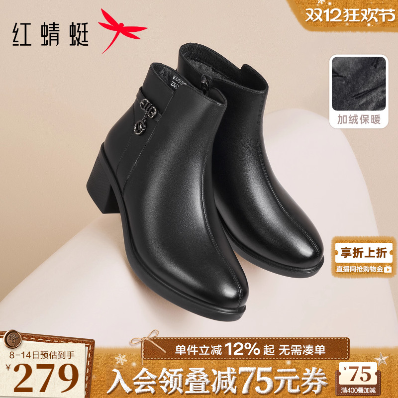 红蜻蜓妈妈靴子2025冬季新款女鞋靴粗跟羊皮短靴真皮加绒女士皮鞋