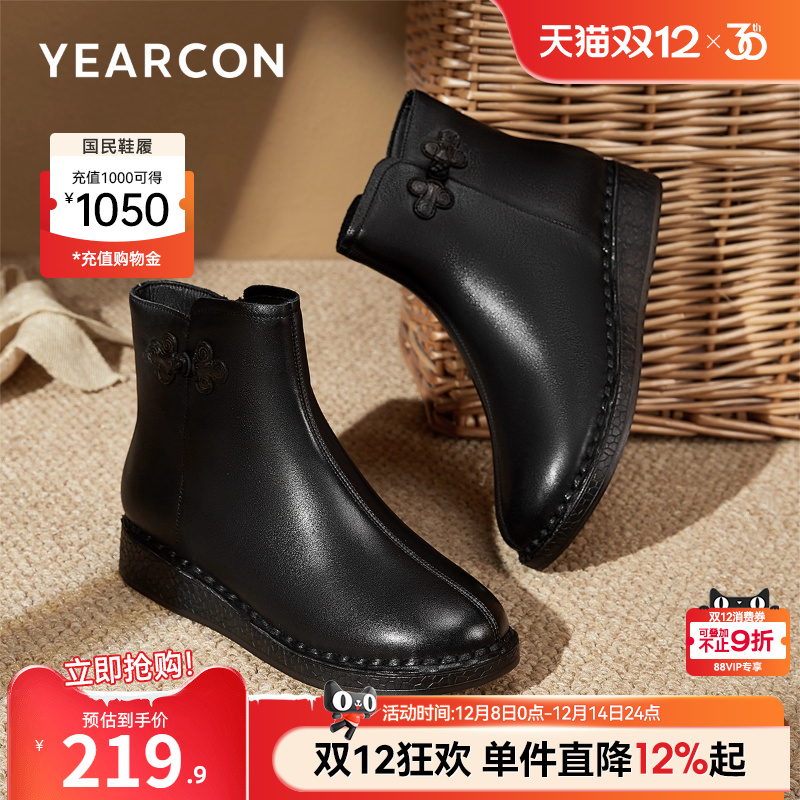 意尔康女鞋冬季靴子短靴真皮皮靴中老年妈妈皮鞋加绒棉鞋保暖女靴