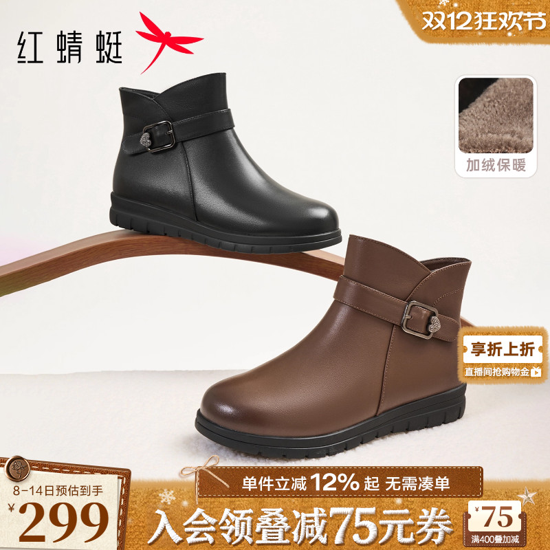 红蜻蜓冬季女鞋靴子女短靴秋冬真皮加绒保暖妈妈皮靴棉鞋加厚女靴