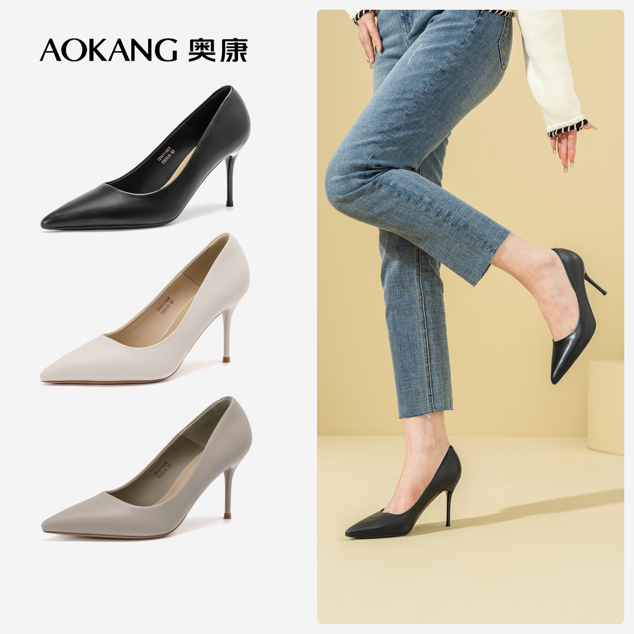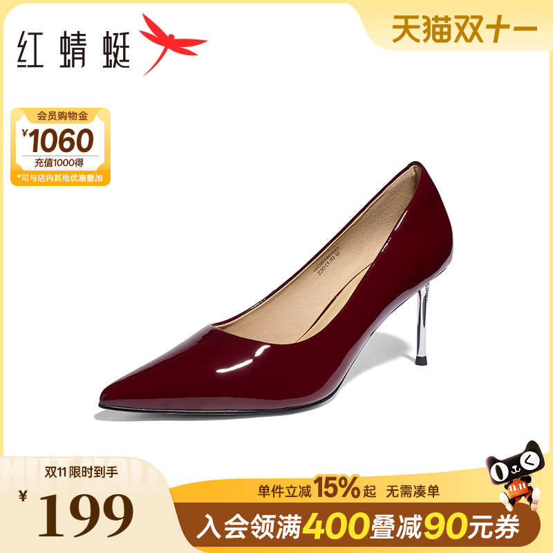红蜻蜓红色高跟鞋婚鞋尖头女鞋法式气质细跟银色单鞋黑色职业皮鞋