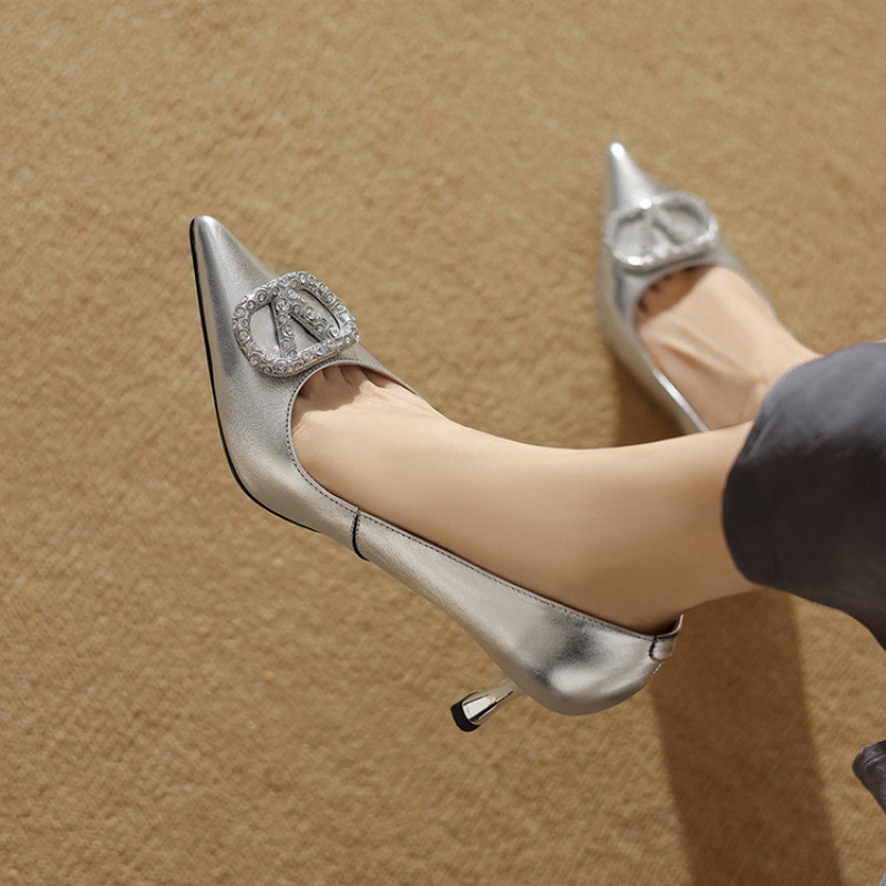2025年春季新款浅口银色高跟鞋细跟百搭性感尖头金属石头纹女单鞋