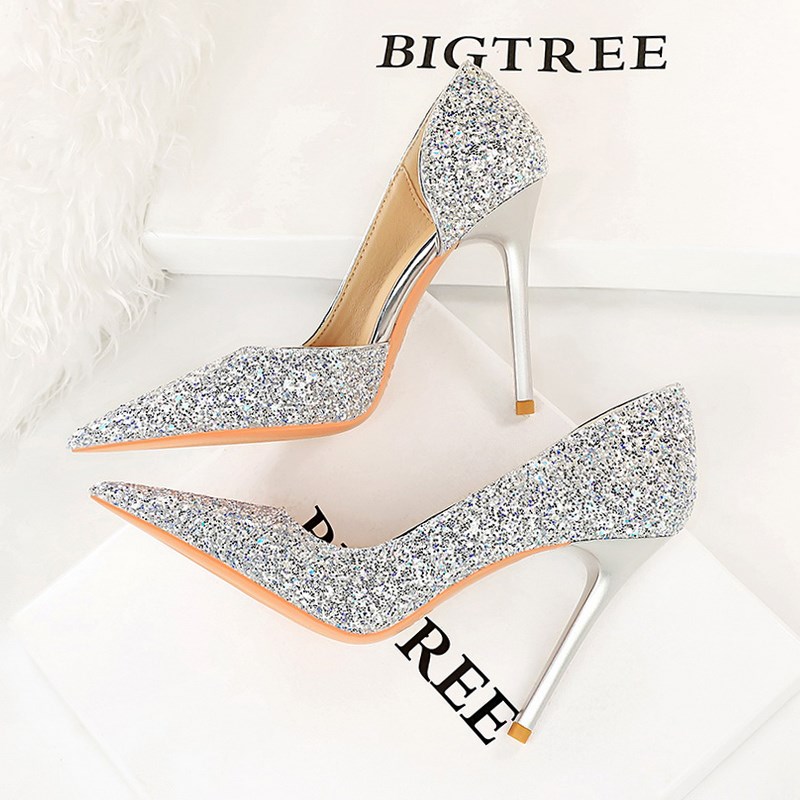 韩版2025春夏季新款女鞋水晶银色高跟鞋细跟百搭性感亮片公主婚鞋
