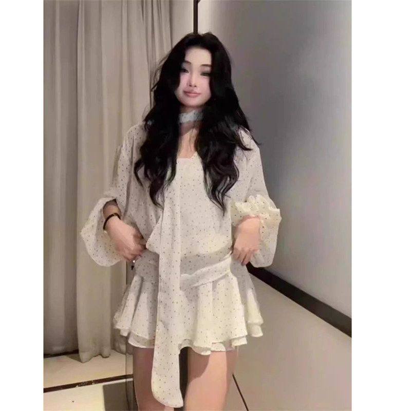 大码波点飘带雪纺长袖连衣裙女春夏法式气质收腰显瘦荷叶边短裙子