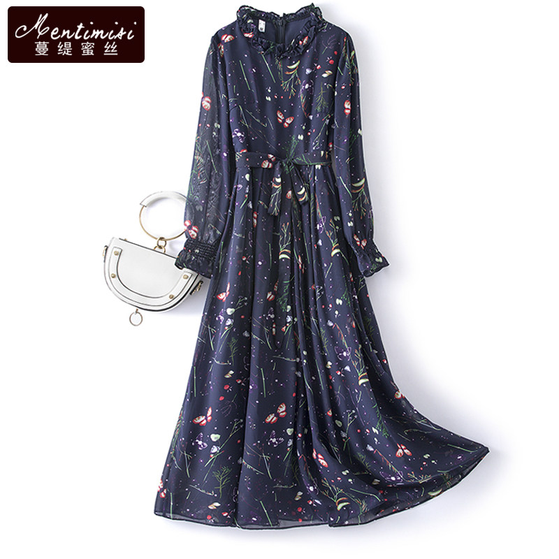长袖雪纺连衣裙女2022新款收腰显瘦休闲气质荷叶边长款碎花裙大码