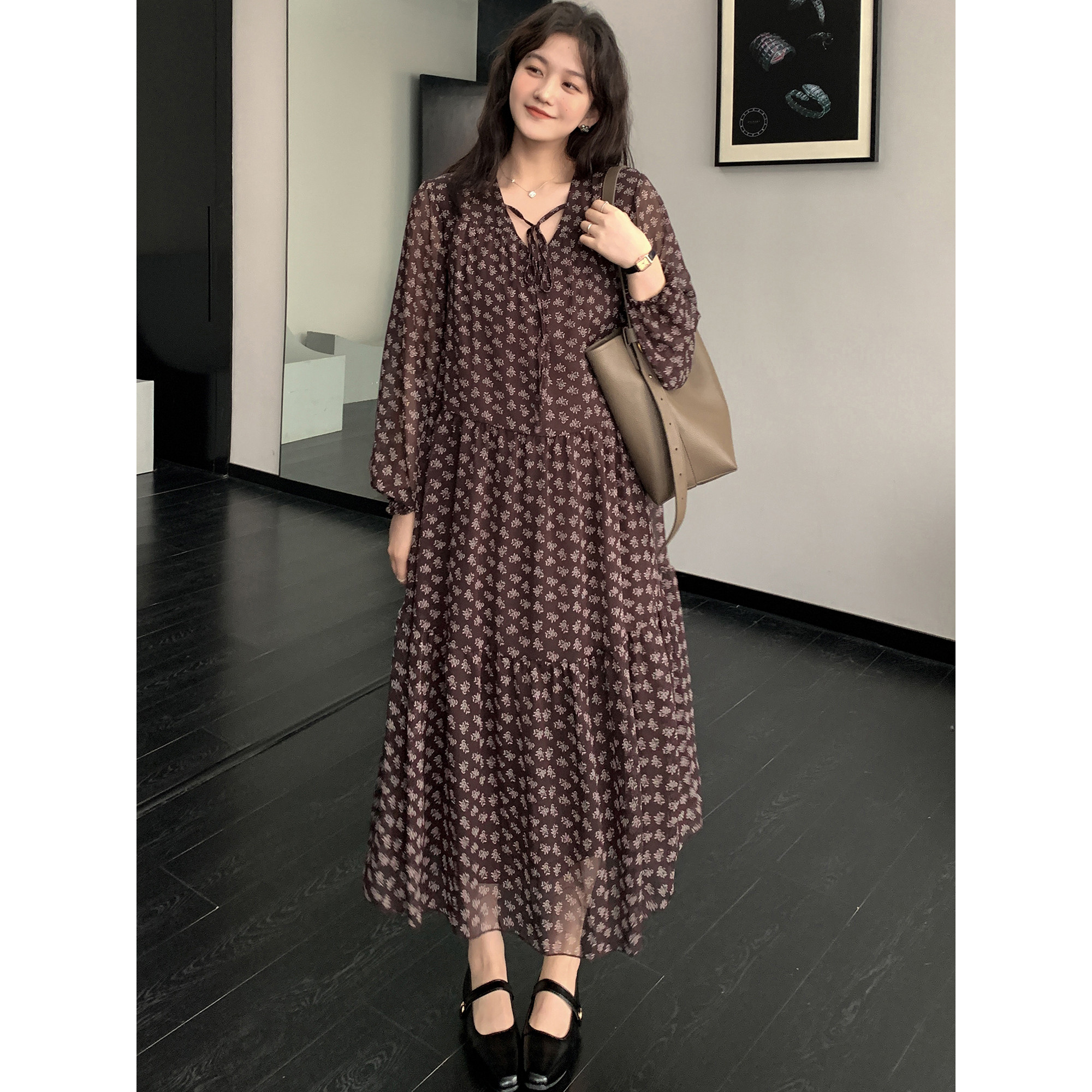 秋季新款连衣裙女长袖碎花大码雪纺宽松显瘦大摆长裙仙女度假裙子