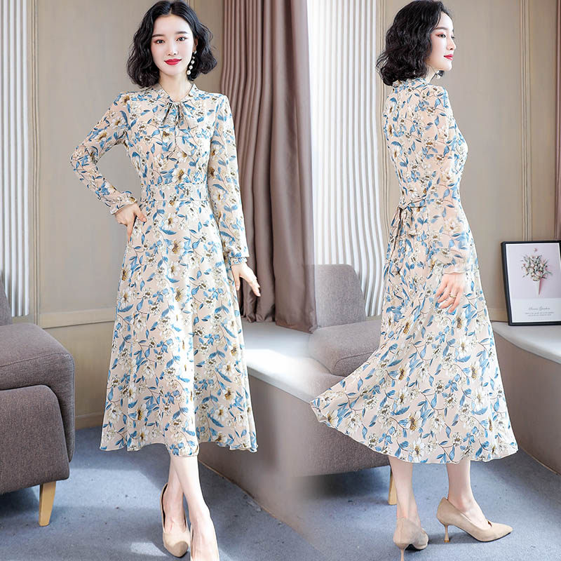 秋装长袖雪纺连衣裙女2020新款大码气质长款过膝修身显瘦裙子休闲