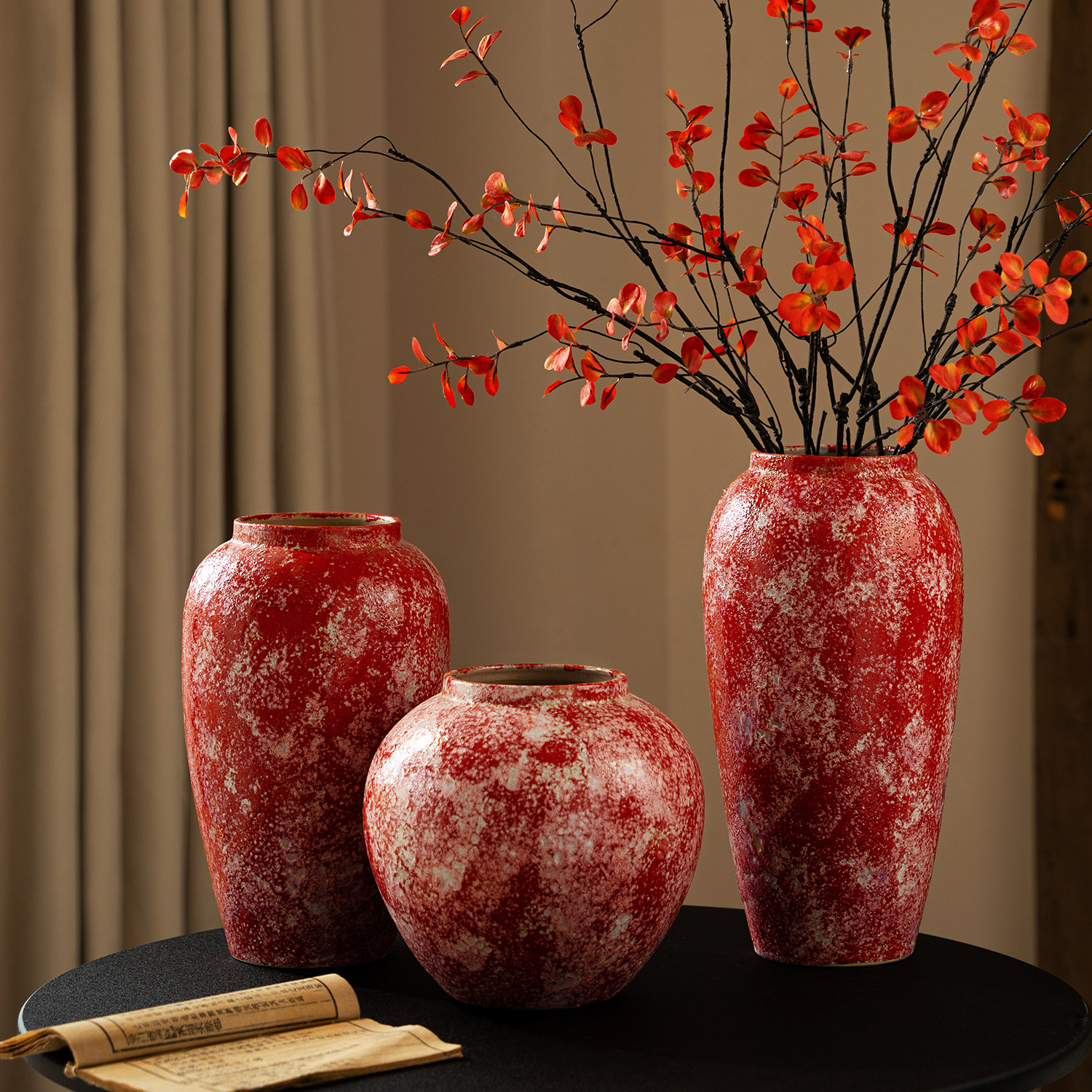 新中式复古陶瓷花瓶红色高级感客厅干花插花落地大号餐桌装饰摆件