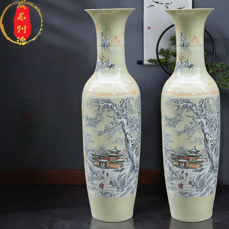 威弗列德黄色大号特大手绘雪景中式景德镇陶瓷客厅落地大花瓶摆件