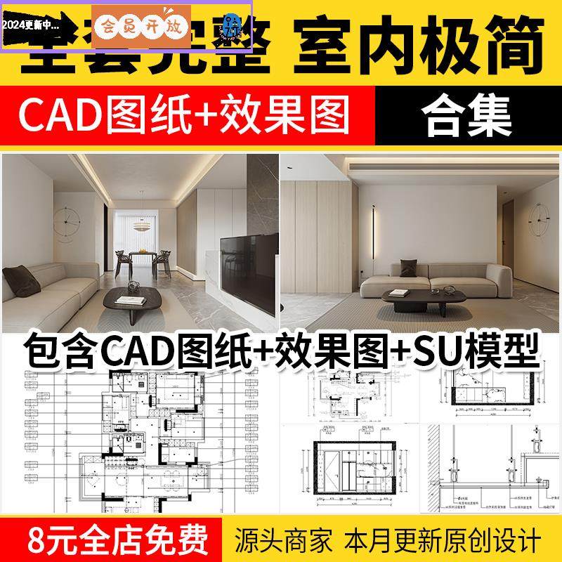 极简风格CAD施工图 现代装修设计全套水电平面立面房屋室内效果图
