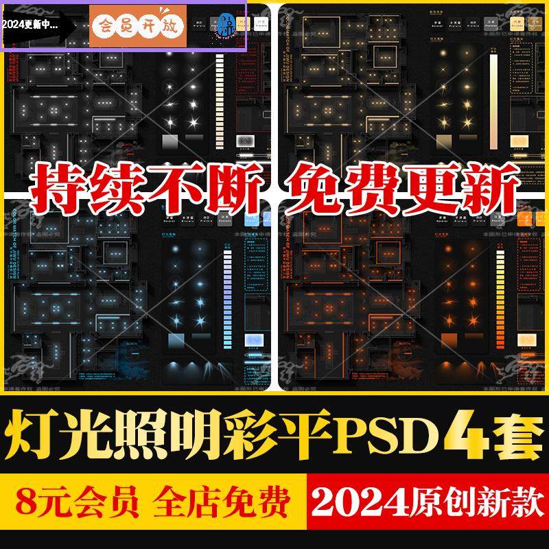 别墅大平层样板房室内效果图灯光照明彩平图PSD免抠素材源文件