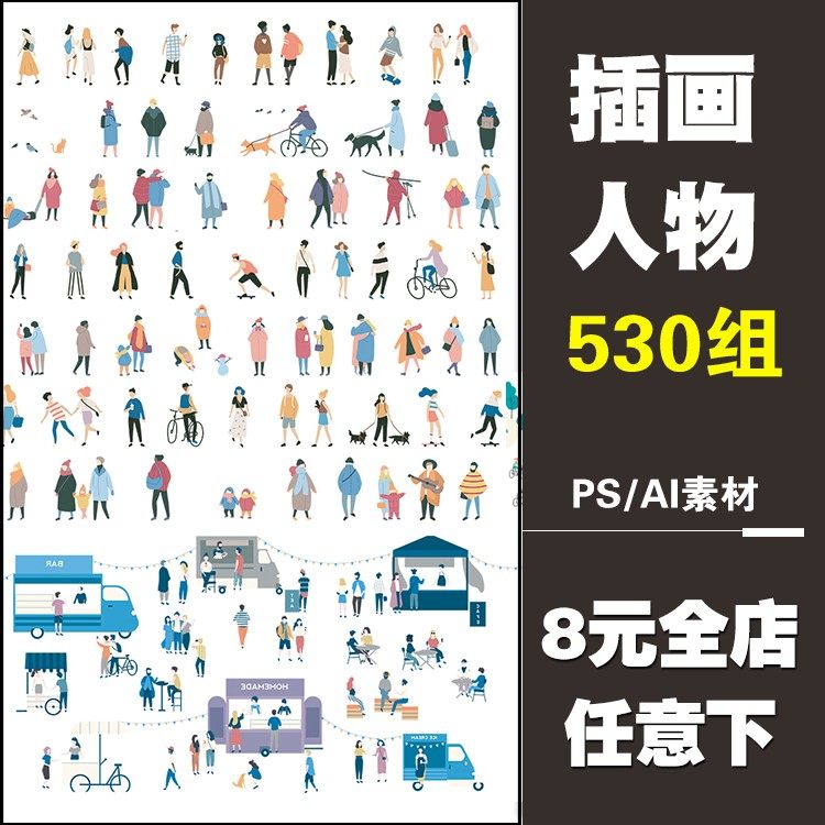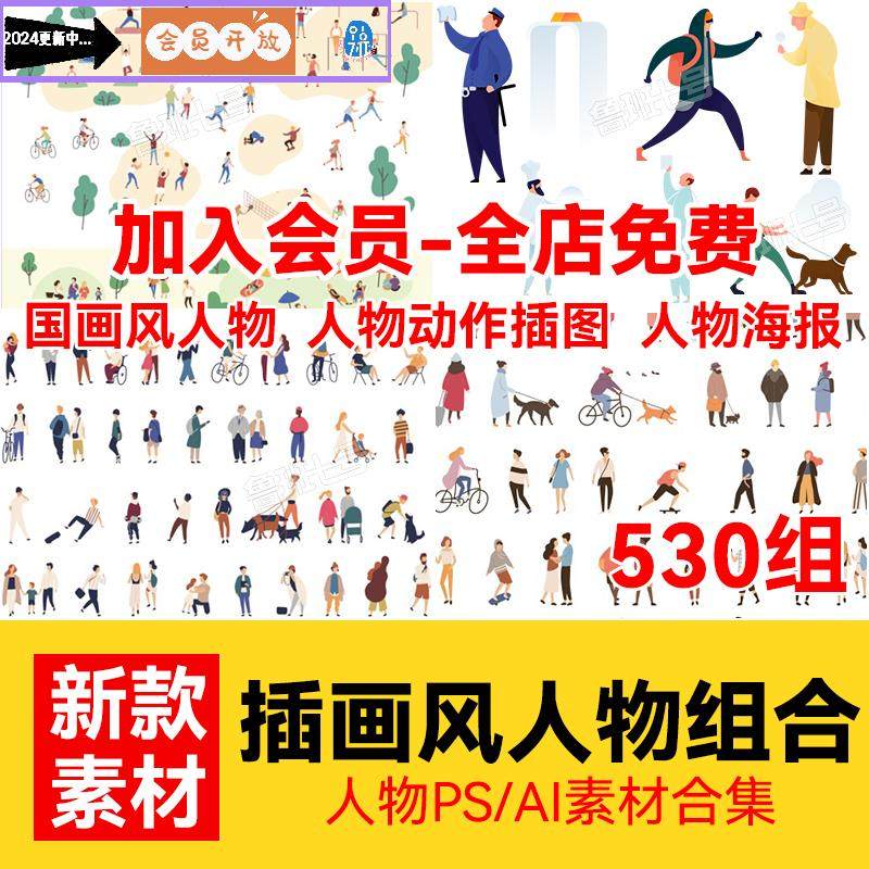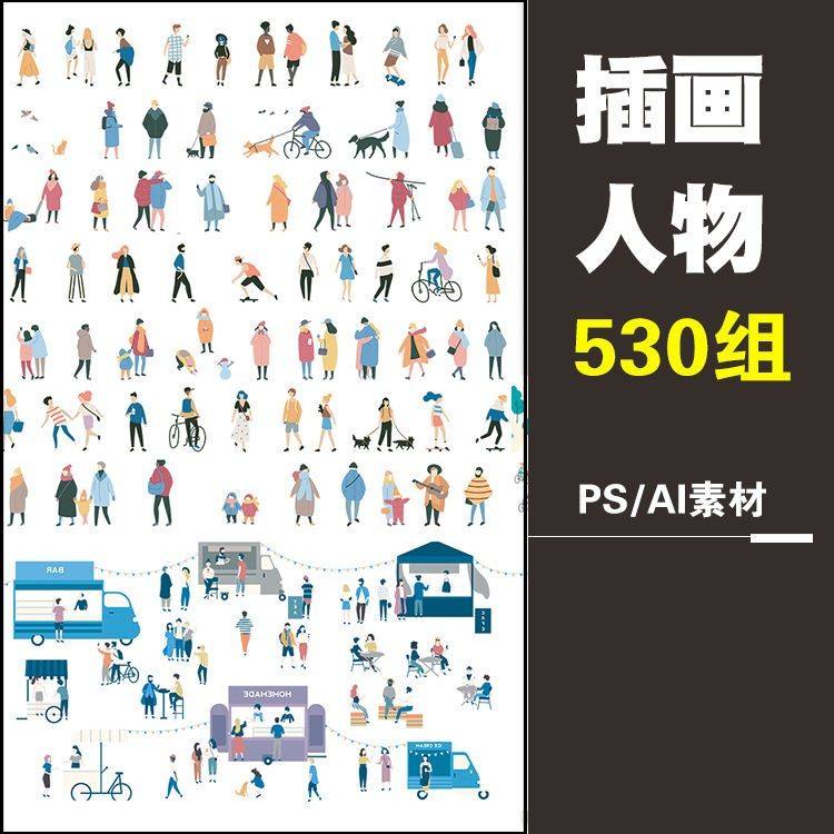 插画风建筑景观小清新ps配景人物室内效果图ai矢量后期psd素材