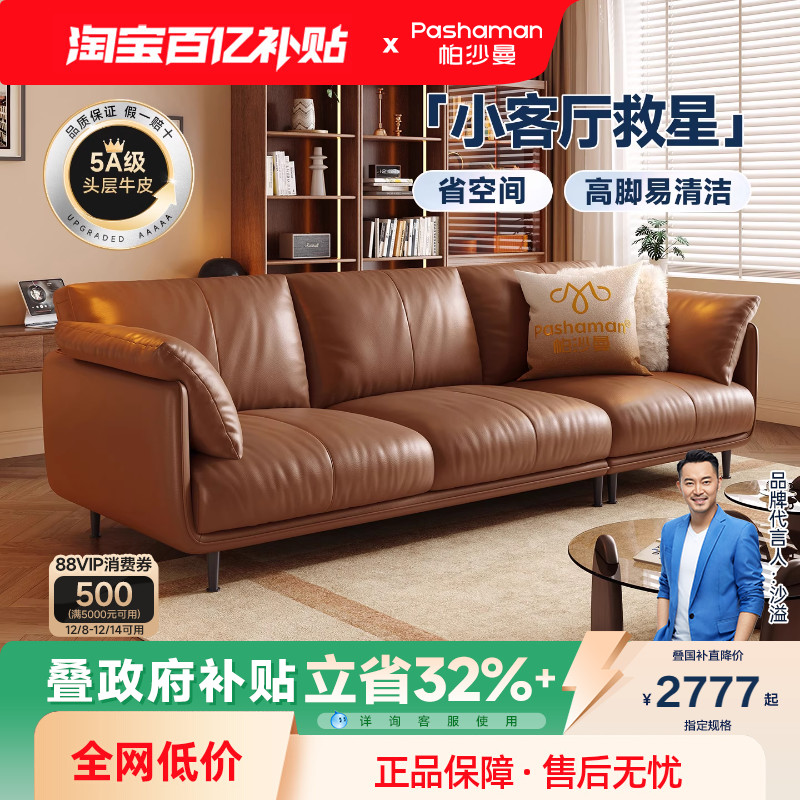 帕沙曼真皮沙发中古风小户型客厅头层牛皮现代简约窄版直排三人位