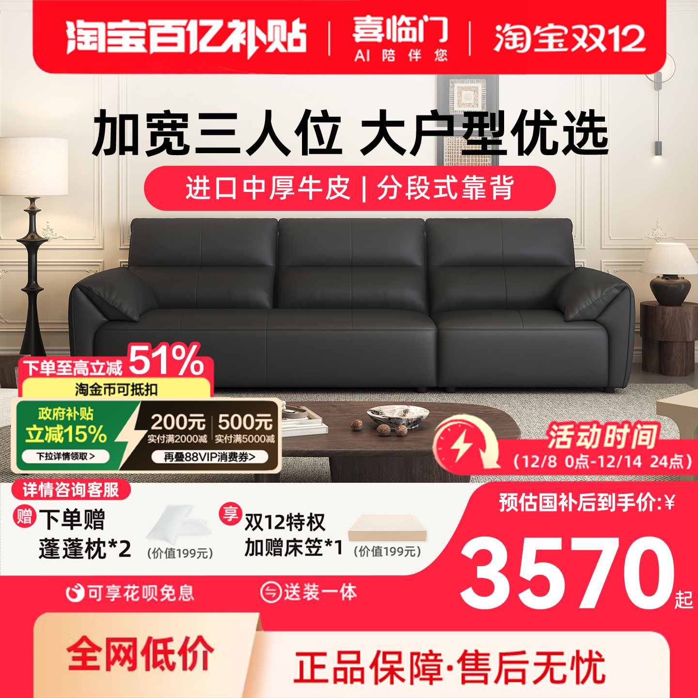 全友家居现代简约真皮沙发2025新款客厅大黑牛头层牛皮三人位沙发