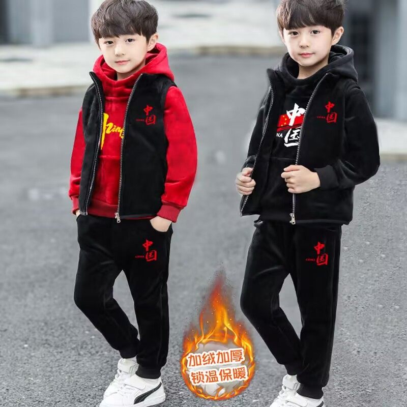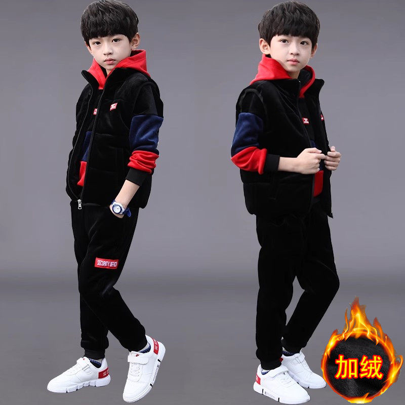 男童冬装金丝绒加厚三件套新款儿童加绒卫衣套装男孩中大童棉服韩
