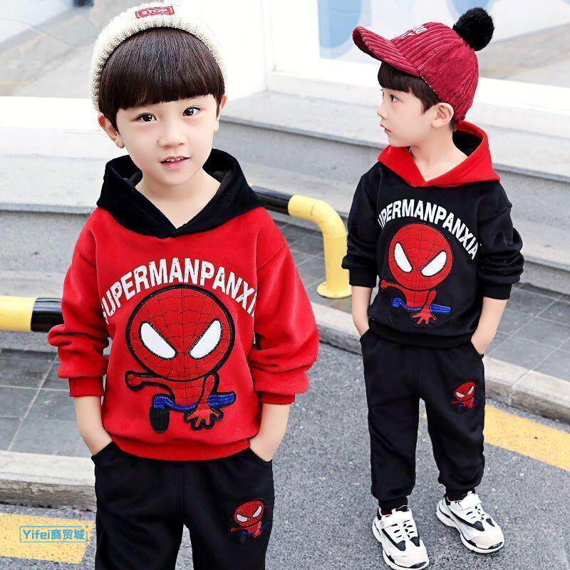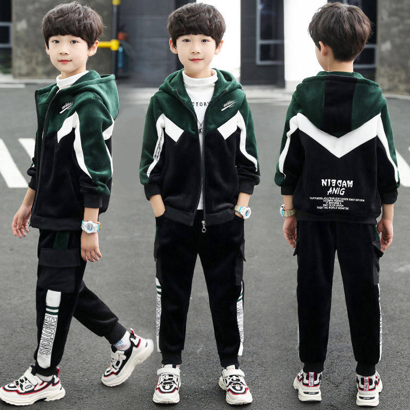 童装男童金丝绒儿童春秋装新款中大童男孩加绒加厚双面绒卫衣套装