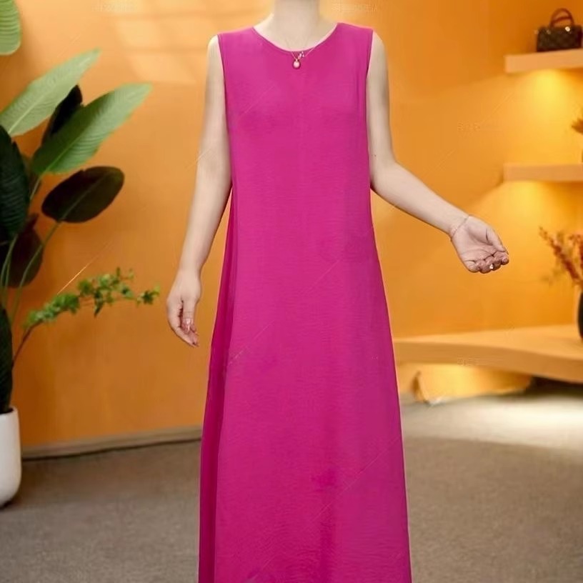2025夏季中长款背心裙纯色圆领宽松大码遮肚显瘦新中式无袖连衣裙