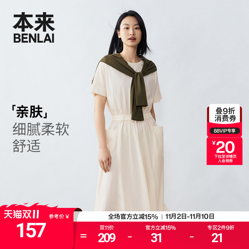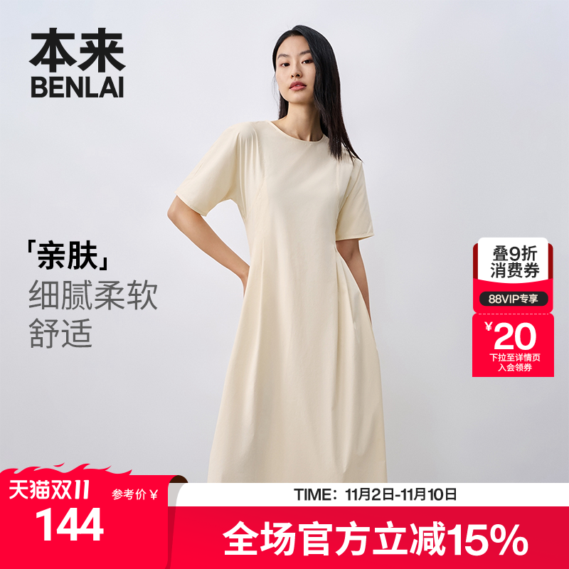 本来BENLAI女士圆领连衣裙夏季新款简约休闲蝙蝠袖轻薄中长裙