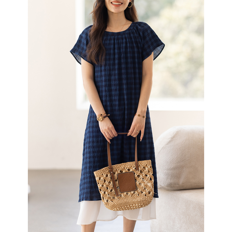 单/两件 纯色圆领连衣裙女夏季简约文艺复古宽松显瘦大码中长款裙