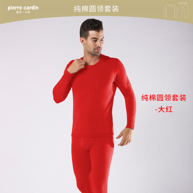 皮尔卡丹内衣男100%纯棉保暖秋衣秋裤男士圆领全棉本命年大红套装