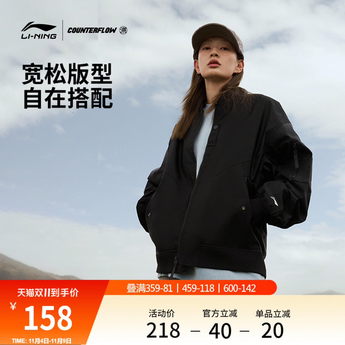李宁户外CF溯丨飞行员夹克男秋冬工装棒球服户外宽松运动服外套女
