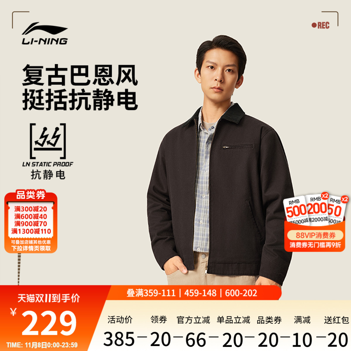 李宁行政夹克男美式飞行秋季新款复古工装翻领哈灵顿巴恩风外套女