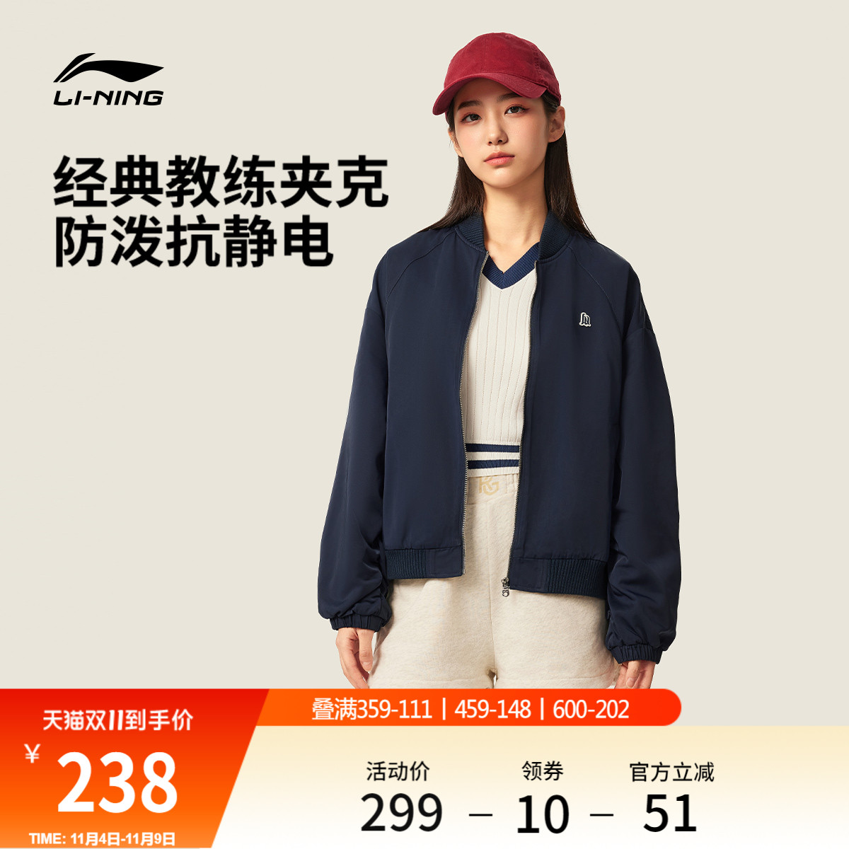 李宁棒球服女秋季新款飞行员教练夹克开衫上衣网球卫衣运动服外套