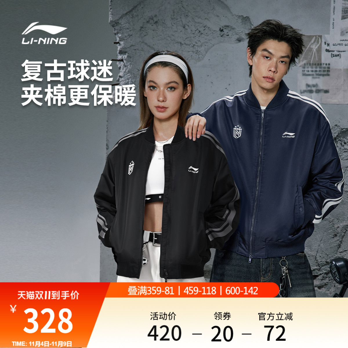 李宁棒球服女秋冬2025新款情侣工装棉服加绒保暖飞行夹克男运动服