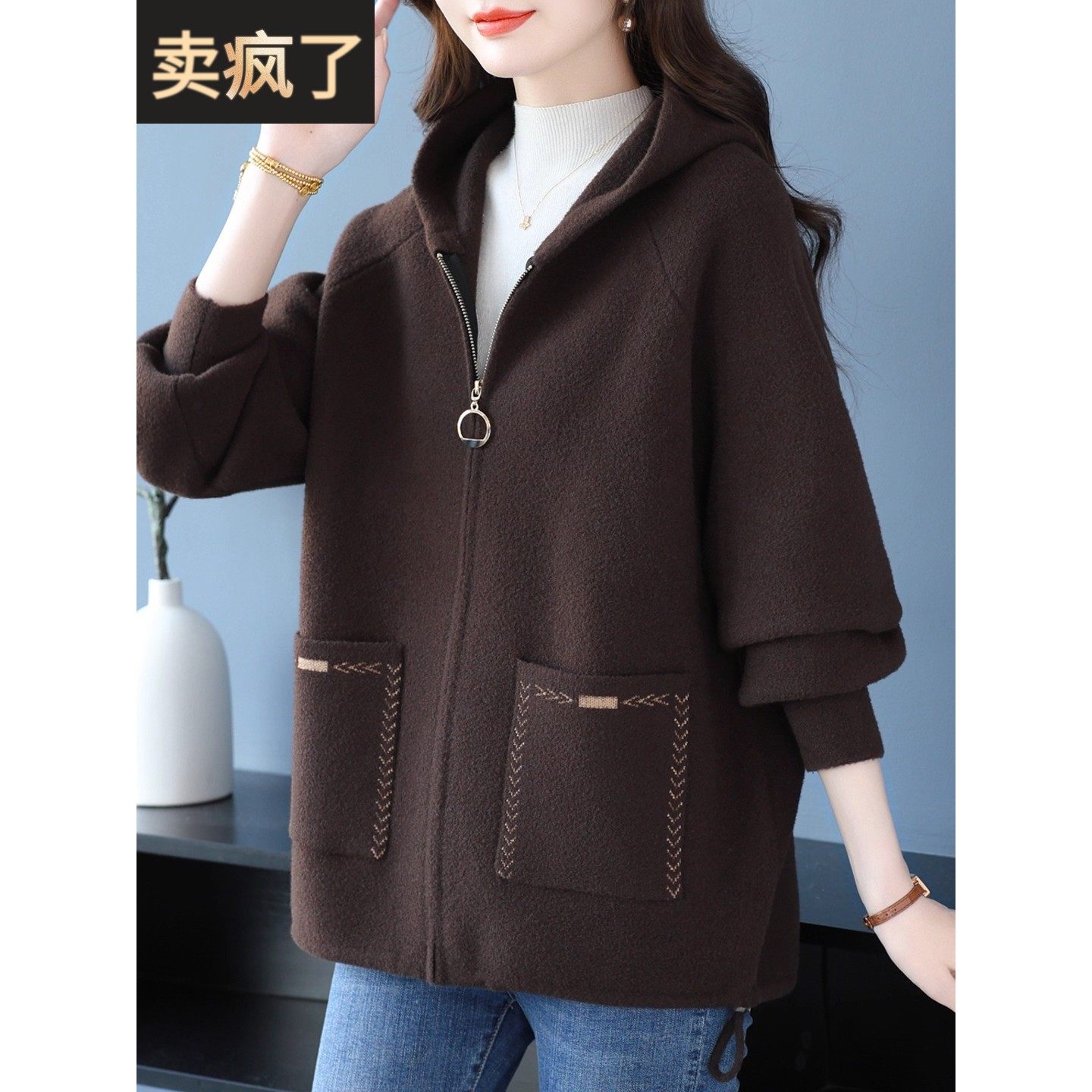 不起球带帽毛呢外套女中长款开衫加厚呢子大衣妈妈款针织春秋羊毛