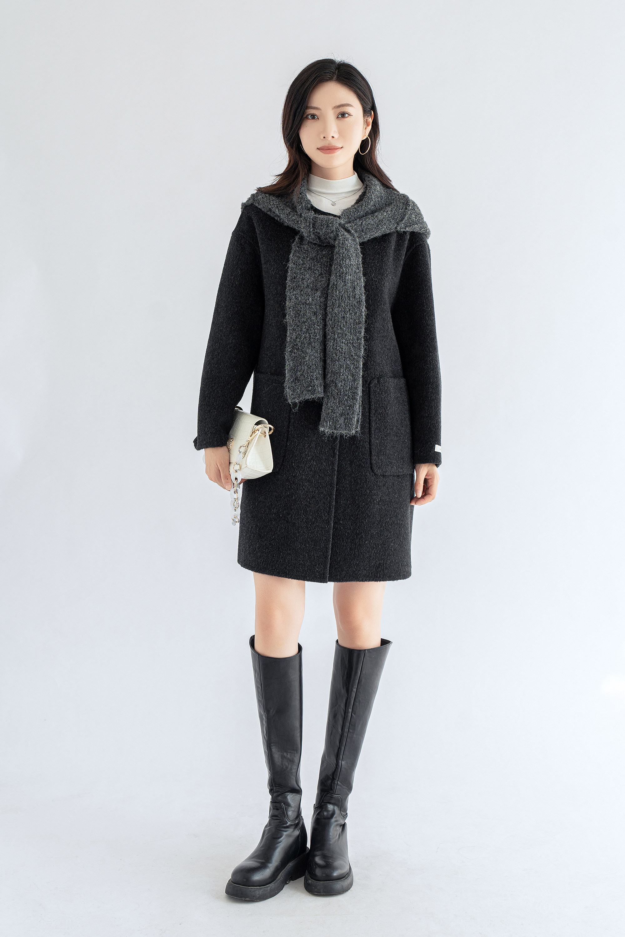 2025新款羊绒羊毛双面呢大衣女中长款碳灰带帽羊毛呢外套n555-5
