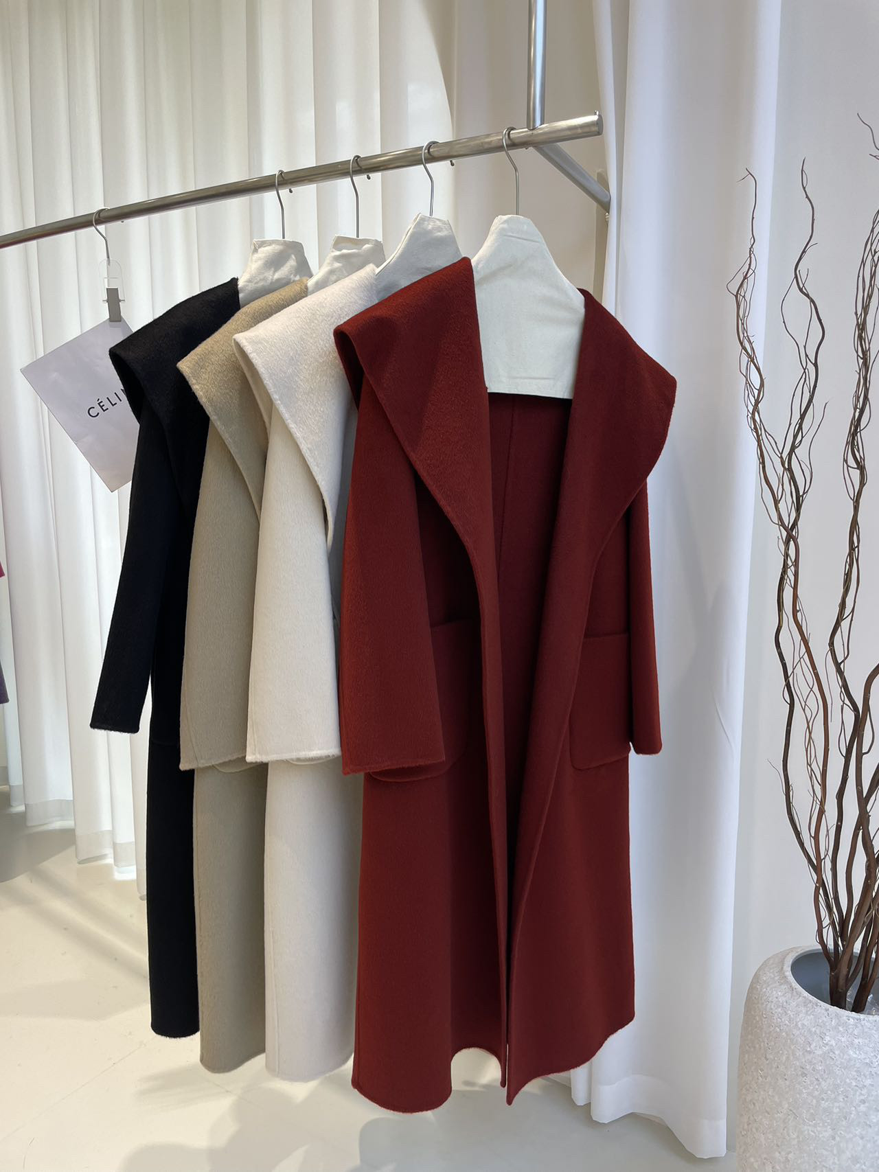 max家双面羊绒大衣女中长款浴袍带帽长款连帽加厚修身毛呢外套