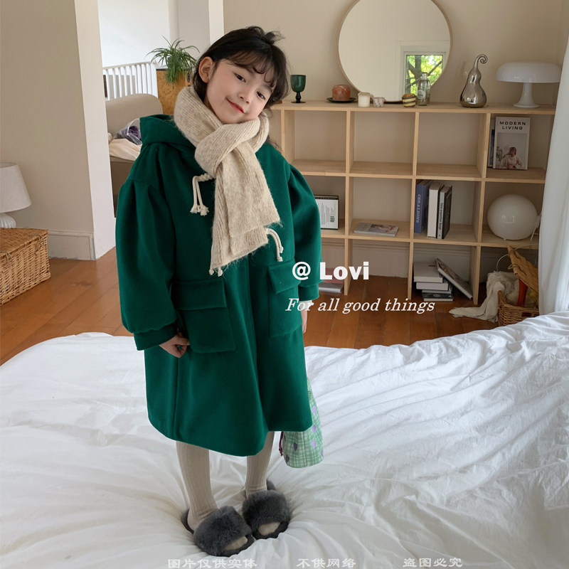 品牌韩版儿童外套22初冬新款女童洋气中长款复古纽扣带帽毛呢大衣