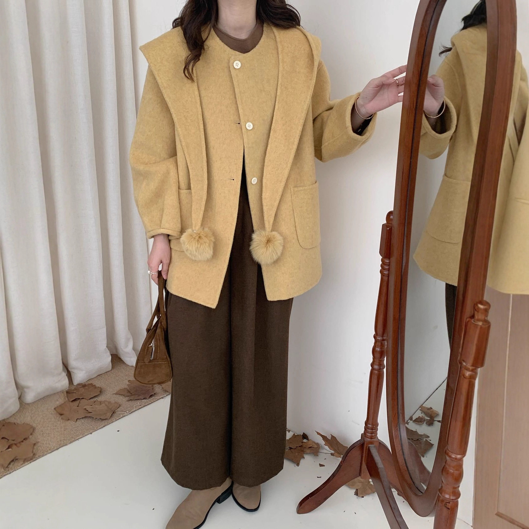 2026秋冬新款双面羊毛大衣女中长款韩版围巾带帽狐狸毛球毛呢外套