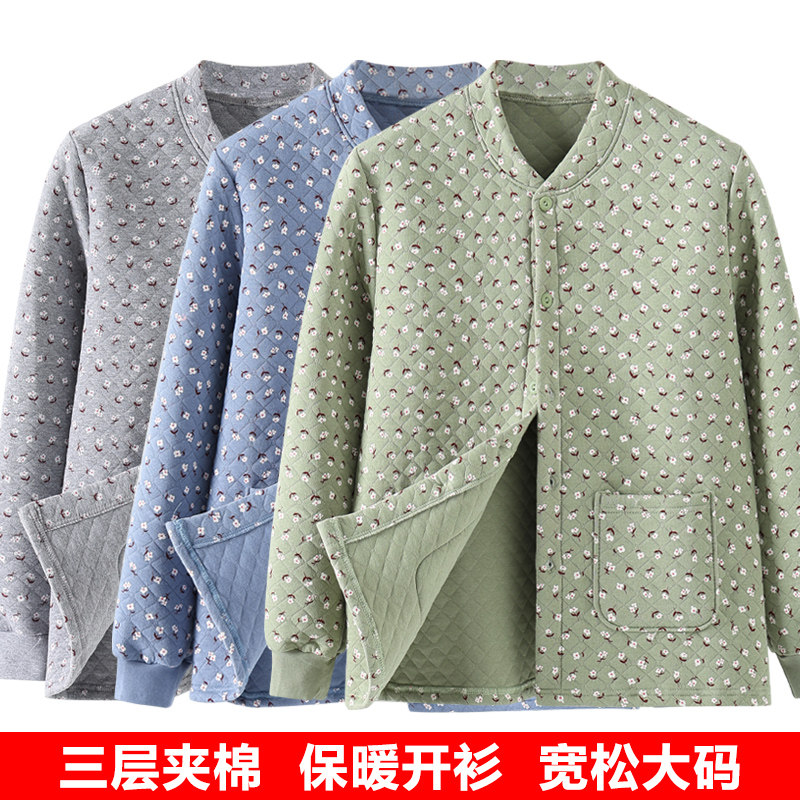 女士三层夹棉保暖上衣秋冬开衫妈妈装中老年人对襟前开扣厚棉毛衫