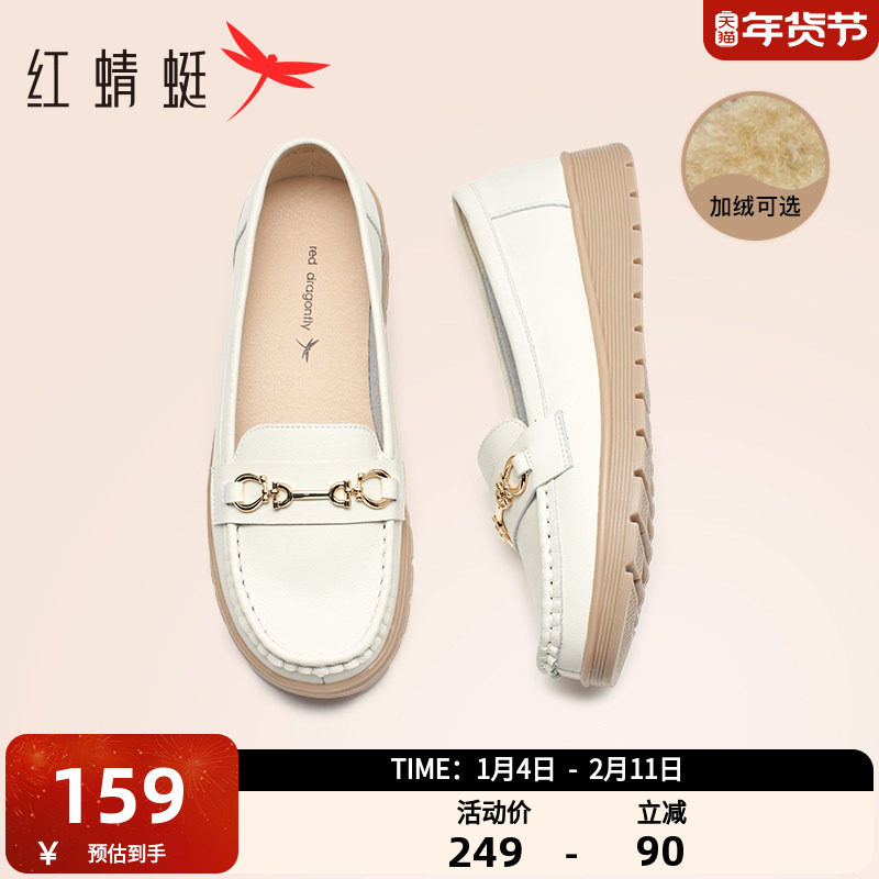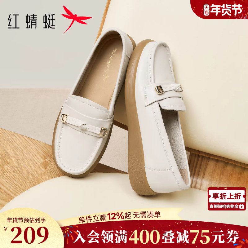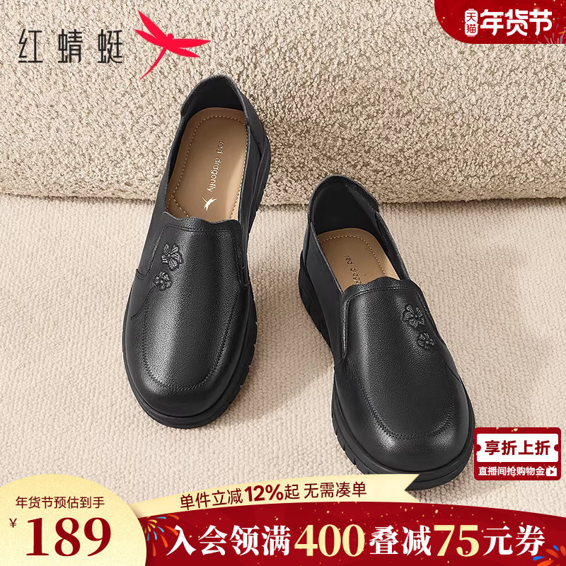 红蜻蜓女鞋2026春季新款真皮妈妈单鞋软底中老年皮鞋女平底乐福鞋