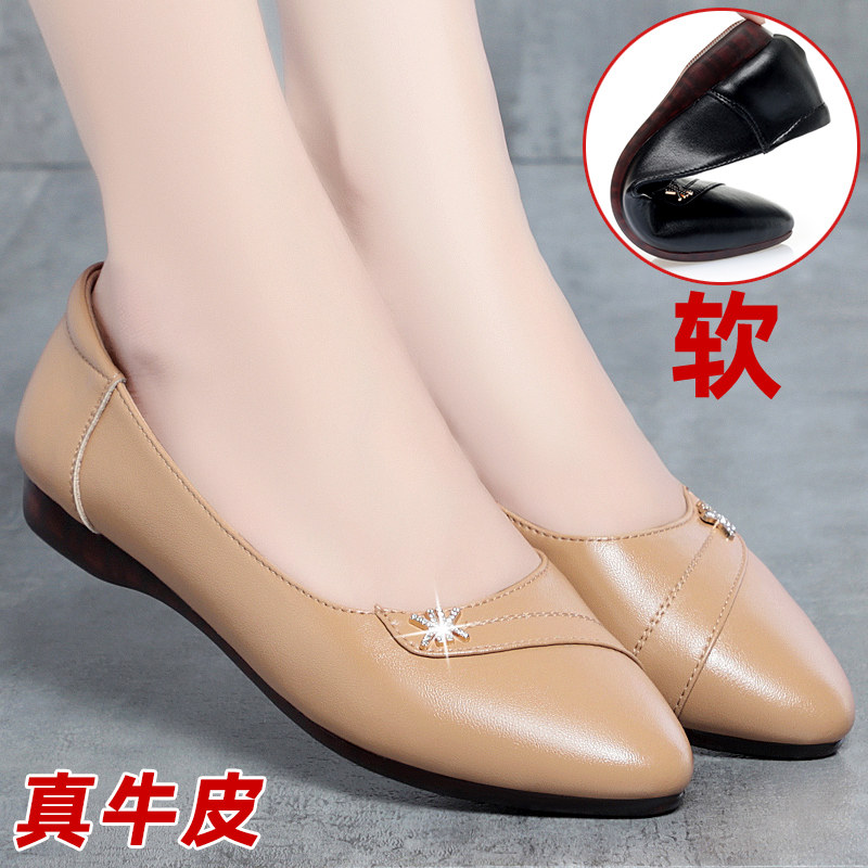 真皮妈妈鞋子春秋款平底单鞋软底防滑中老年皮鞋女舒适软面老人鞋