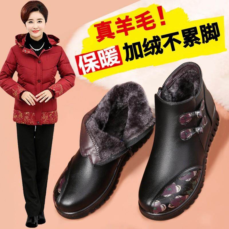 冬季妈妈老人棉鞋保暖真皮加绒皮鞋羊毛短靴女中老年大码平底防滑