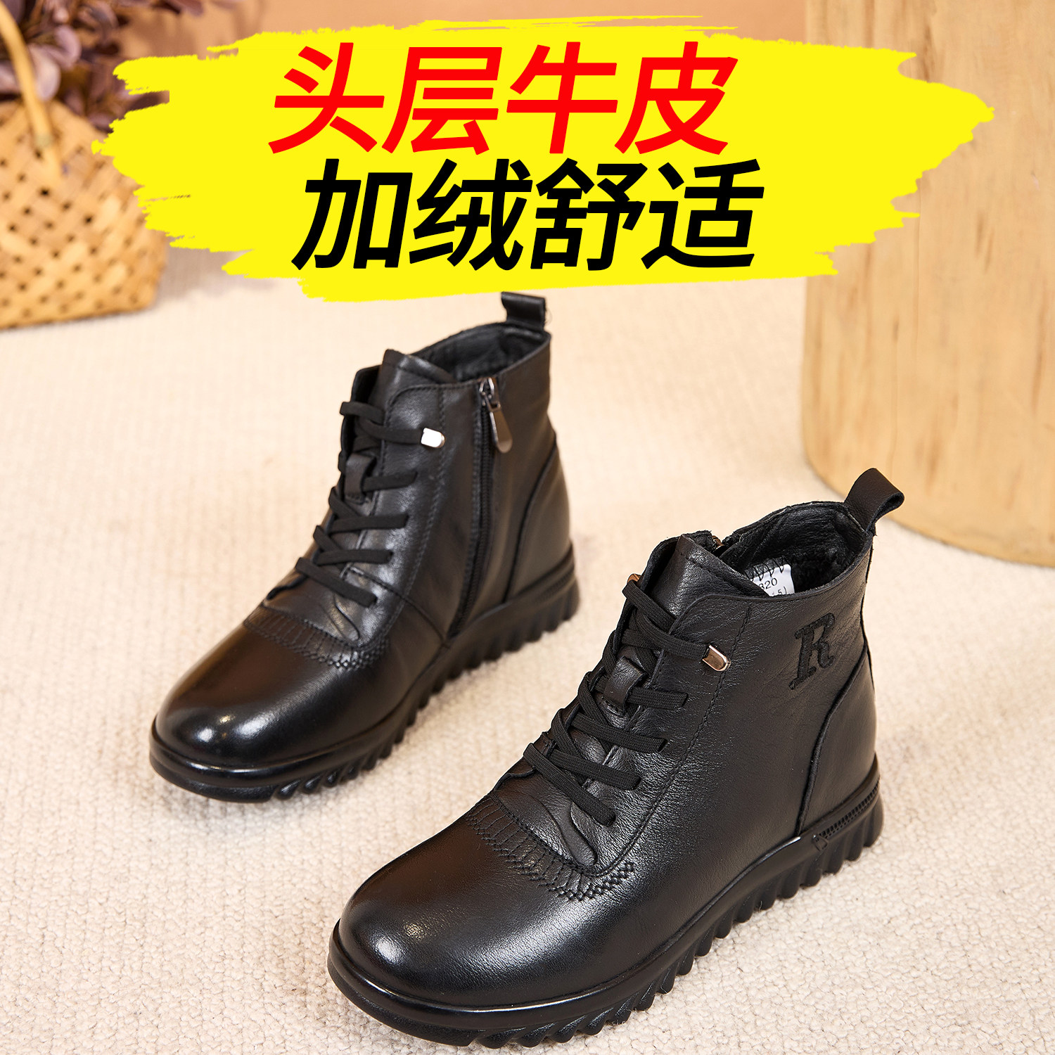头层牛皮冬季妈妈鞋棉鞋加绒保暖中老年皮鞋女鞋老人防滑平底短靴