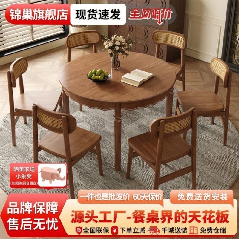 中古风实木圆桌小户型家用饭桌2025新款现代复古咖啡桌餐桌椅组合