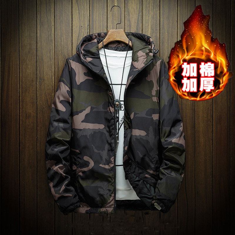 冬季新款青少年迷彩印花外套潮流百搭加绒保暖学生帅气连帽夹克男