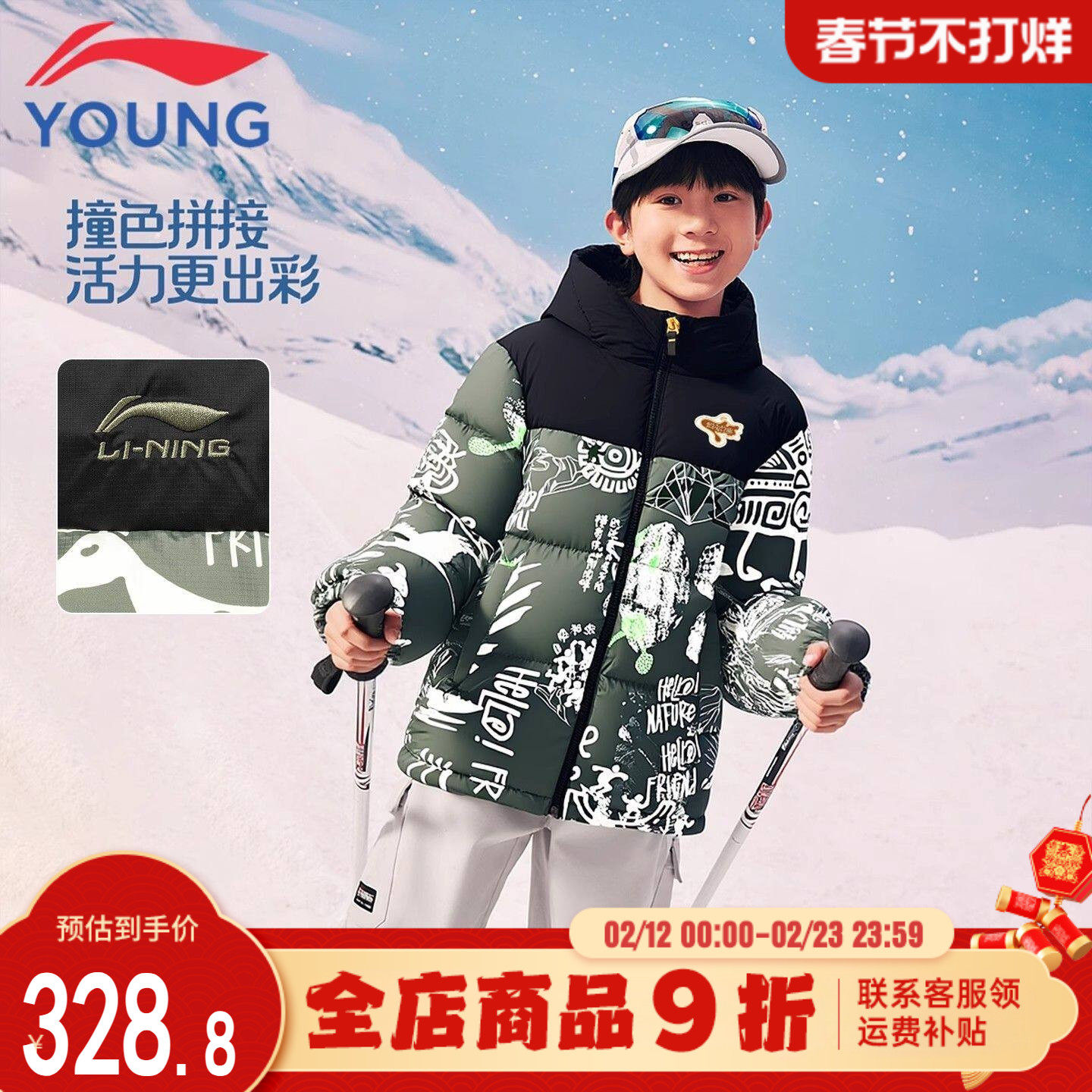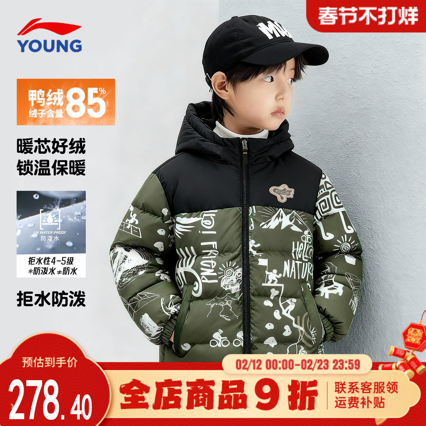李宁儿童羽绒服男童冬季大童青少年学生迷彩鸭绒连帽外套2025新款