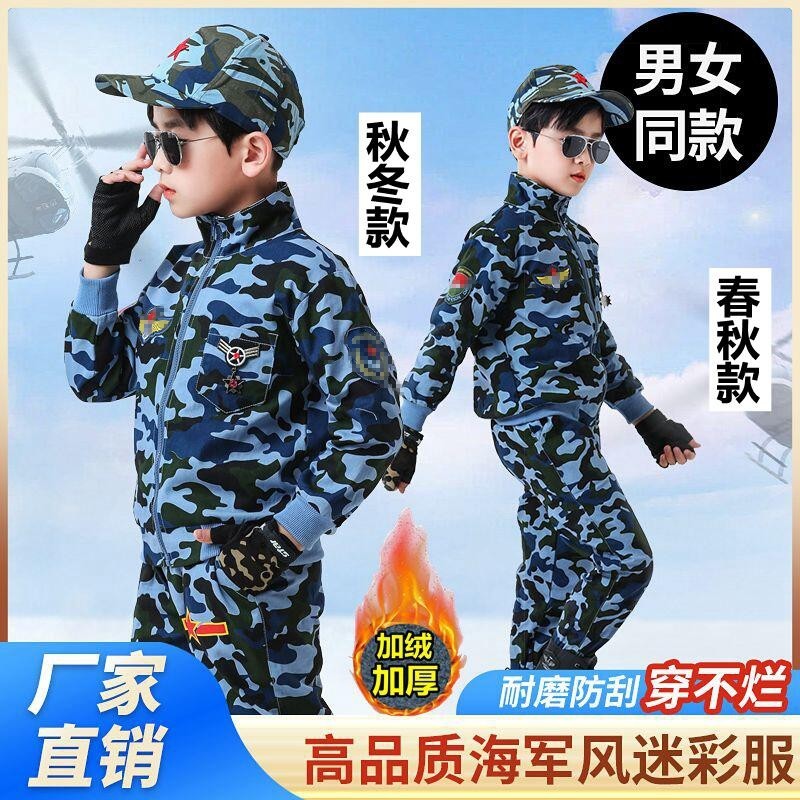 儿童蓝色迷彩服秋冬季套装学生军训服装男童海蓝纯棉外套蓝色警服