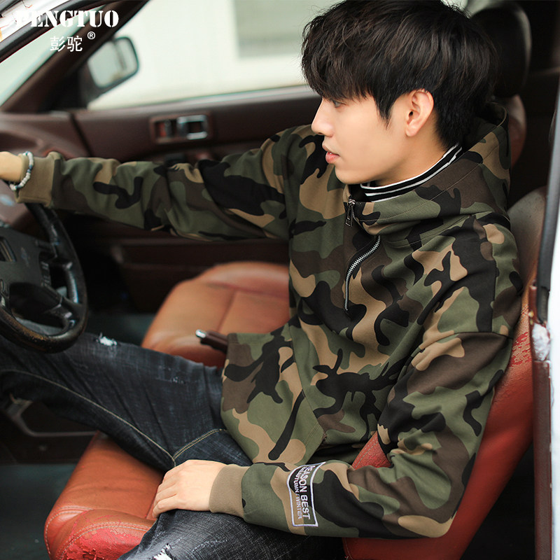 初秋宽松潮牌半拉链高领外套韩版ins迷彩卫衣男连帽潮流港风学生